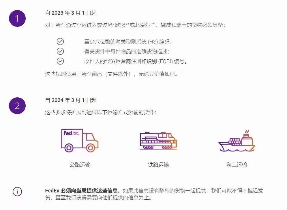 fedex : 自 2023 年 3 月 1 日起 對于所有進入或過境*歐盟**或北愛爾蘭、挪威和瑞士的貨物必須具備