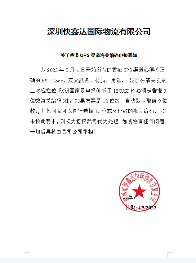 關(guān)于香港UPS海關(guān)編碼申報通知